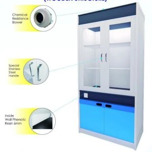 Salah satu dari lemari lab yang mungkin bisa kamu temukan adalah lemari asam. Lemari ini memiliki ukuran yang relatif besar dan berbentuk seperti meja yang terisolasi. Fungsi dari lemari ini adalah mengurangi paparan dari uap bahan berbahaya yang bisa saja muncul.